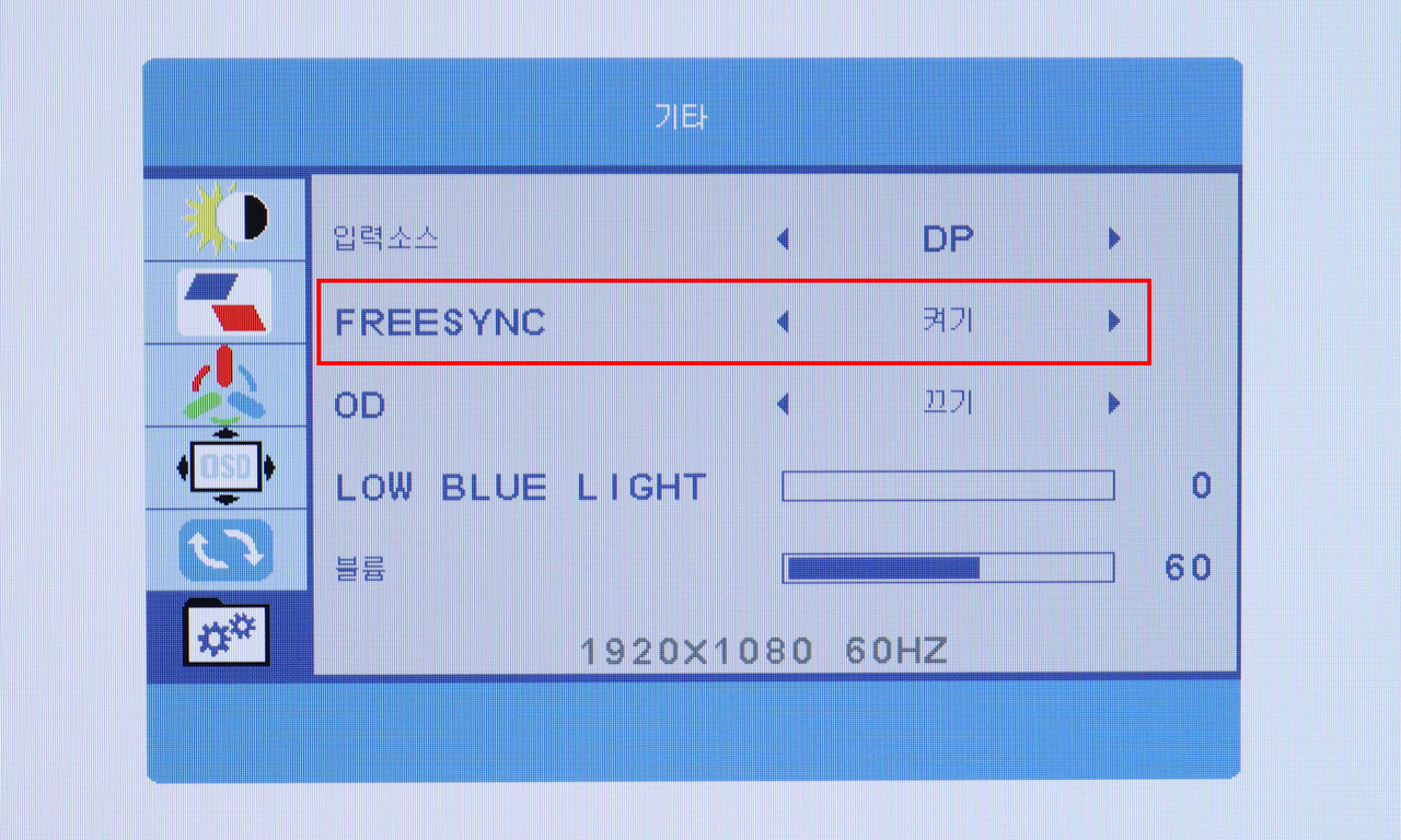 AMD 프리싱크와 엔비디아 지싱크 호환 기술을 사용하려면 우선 카이저 모니터 OSD 메뉴에서 ‘FREESYNC’ 항목을 켜야 한다.
