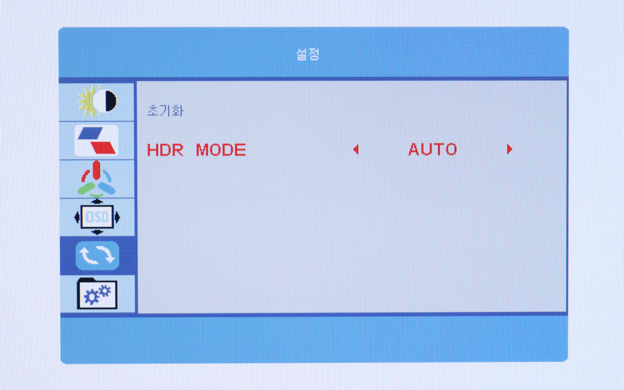 HDR을 이용하려면 OSD 메뉴에서 'HDR MODE’(모드)를 ‘AUTO’나 ‘2084’로 변경해야 한다. AUTO는 전반적인 HDR 콘텐츠에 대응하는 모드, 2084는 HDR 비디오(동영상) 콘텐츠에 최적화된 모드다.