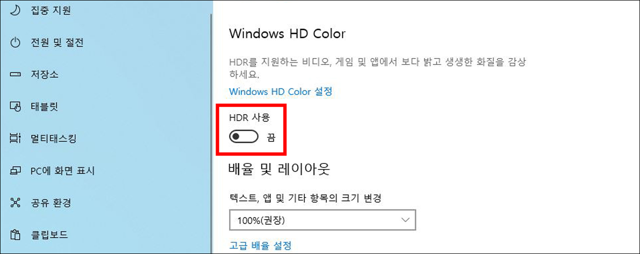 OSD 메뉴에서 HDR을 켠 다음에는 운영체제에서도 HDR 항목을 설정해야 한다.