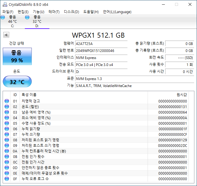 인터페이스 : M.2 2280, PCIe Gen3 x4 32GT/s