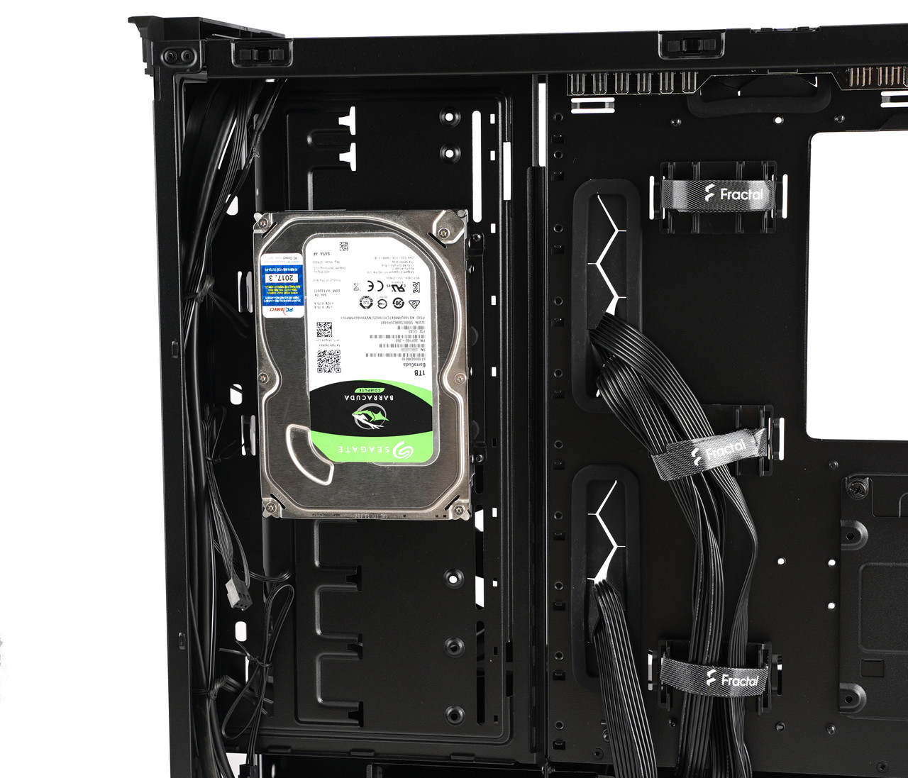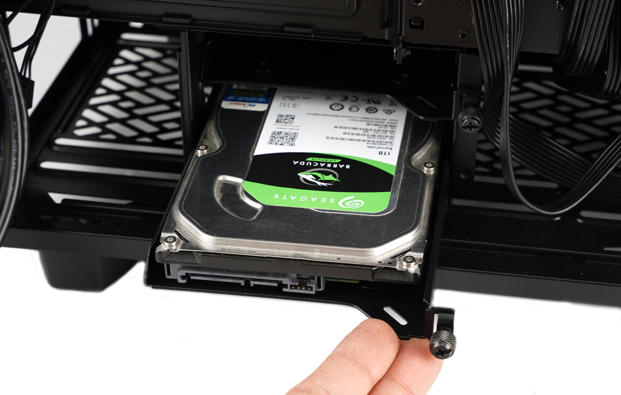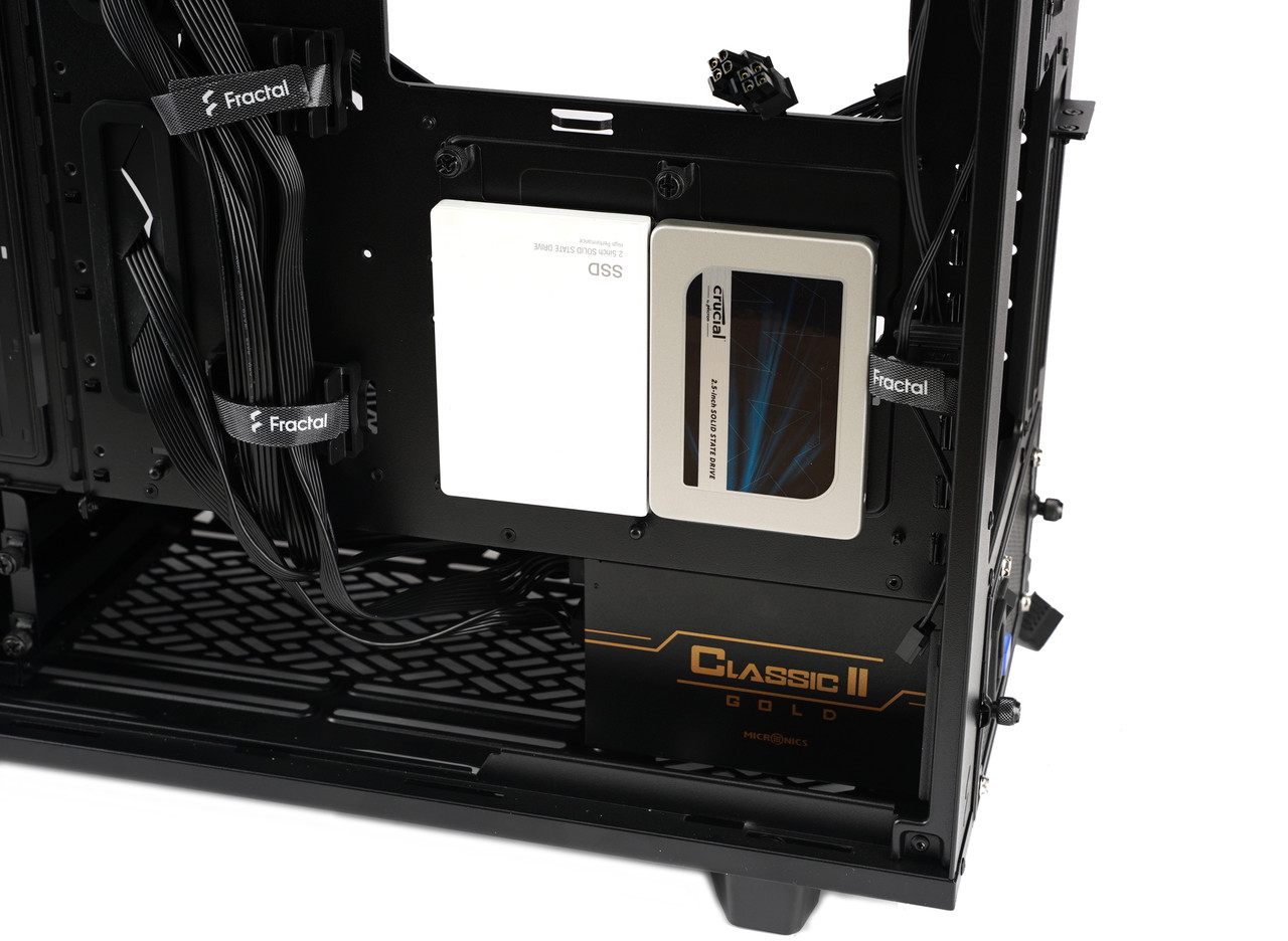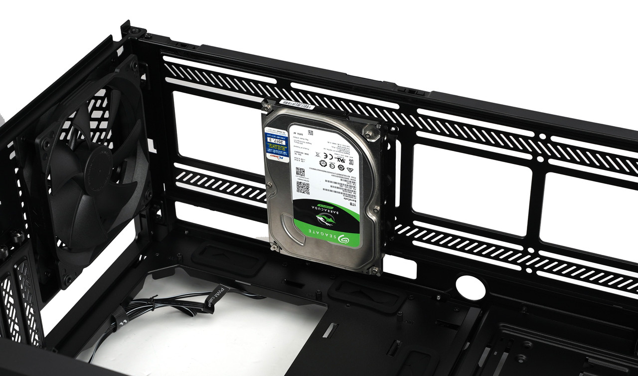 처음에 3.5/2.5 범용 드라이브 트레이가 장착된 곳은 물론이고 전면 패널 뒤쪽 공간과 케이스 상단에도 설치 가능해서 HDD와 SSD를 다양한 위치에 둘 수 있다.