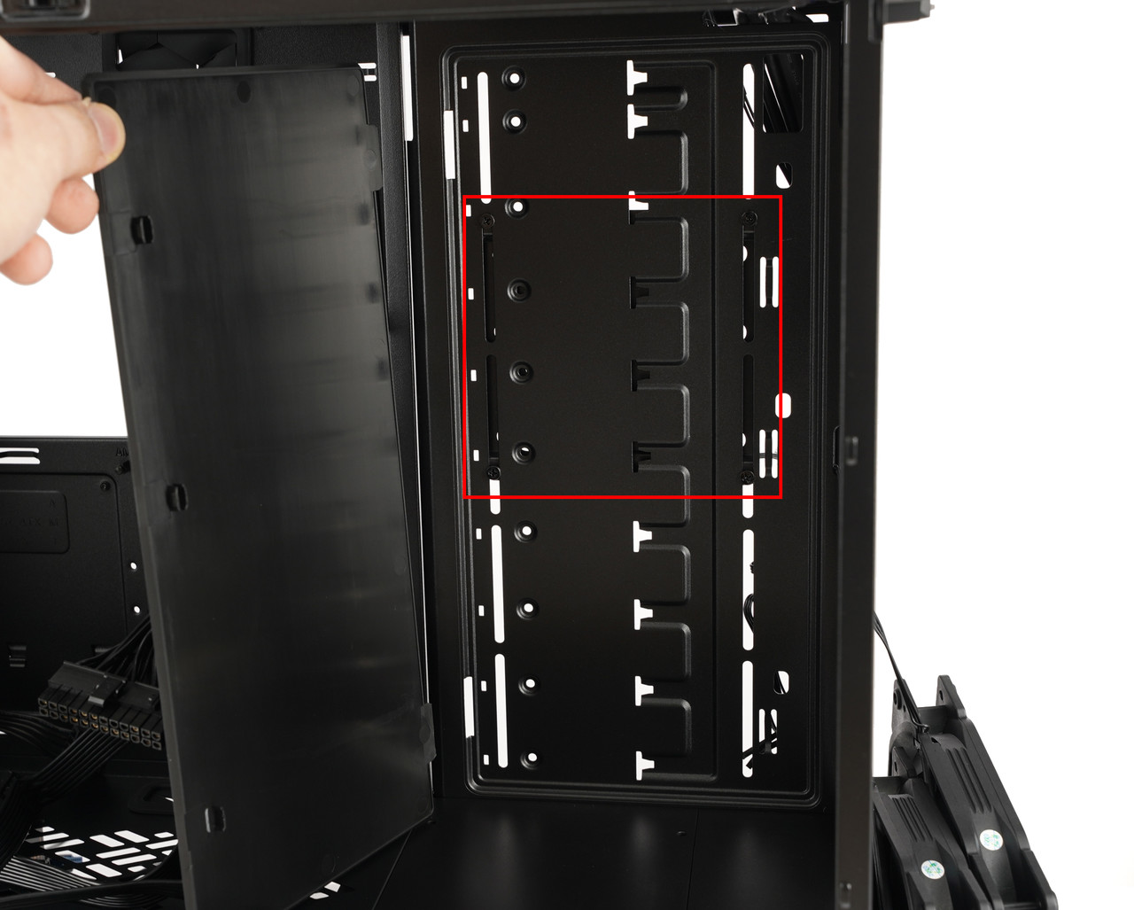 한편 3.5/2.5 범용 드라이브 브래킷은 2개만 있기 때문에 HDD나 SSD를 3개 이상 사용하고 싶은 사람은 아쉬움을 느낄 텐데 그럴 필요는 없다. 위 사진처럼 전면 쿨링 팬 뒤쪽에 있는 고정판을 분리하면 붉은색 칸으로 표시한 곳에 작은 금속판이 있는데, 바로 ‘3.5/2.5 범용 드라이브 트레이’다. 나사 4개를 풀어서 분리하면 거기에 HDD · SSD를 설치할 수 있다.