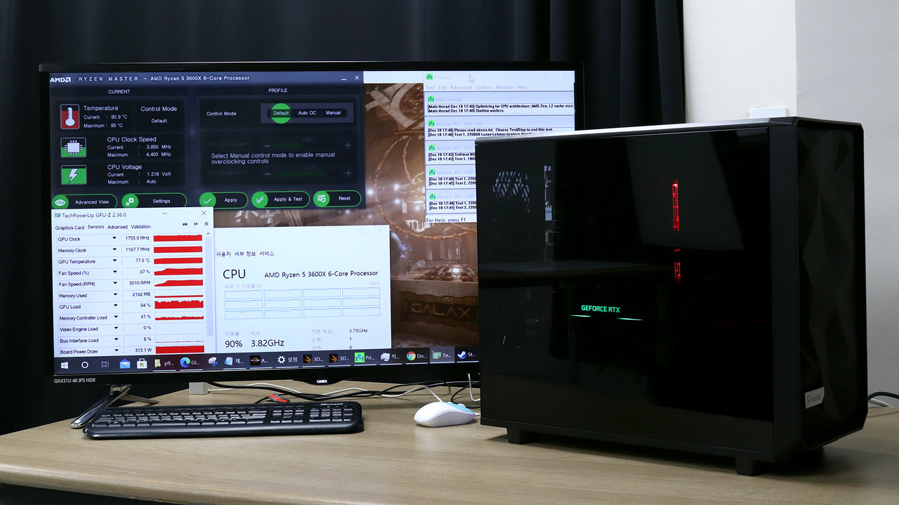 메시파이 2 블랙 다크 강화유리에 설치한 테스트 시스템은 CPU 온도가 90°C를 넘어가기는 했지만 최고치인 95°C까지 올라가지는 않았고, CPU 클럭은 라이젠 5 3600X 기본 클럭인 3.8GHz(기가헤르츠) 이상을 꾸준하게 유지하였다.