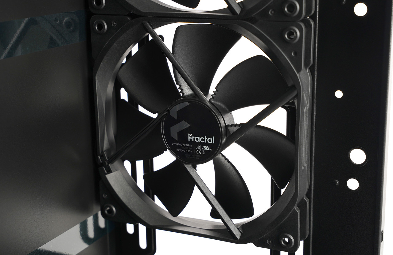 전면 패널 바로 뒤에는 140mm 쿨링 팬 ‘Dynamic X2 GP-14’가 2개 장착되어 있다. 날개에서 회전축에 가까운 부분은 홈이 3개 파여 있어서 특이한데 항공기 날개와 유사하게 공기 역학을 적용해서 풍량은 높이고 소음은 줄인 것이 특징이다.
