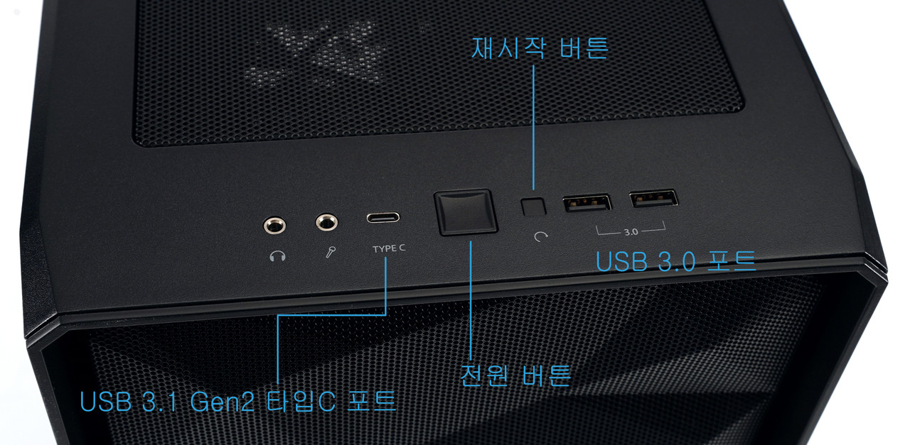 전면 패널 위쪽에는 전원·재시작 버튼과 USB 3.0 포트 등 PC 사용 시 필요한 버튼과 외부 기기 연결용 인터페이스가 있다. 모바일 기기와 외장 SSD용으로 자주 이용되는 USB 타입C(Type-C) 포트는 USB 3.1 Gen2 기반이어서 최대 대역폭이 10Gbps(초당 기가비트)에 달한다. USB 3.0과 비교하면 2배 높은 수준이어서 외장 스토리지를 연결하면 빠른 속도를 기대할 수 있다.