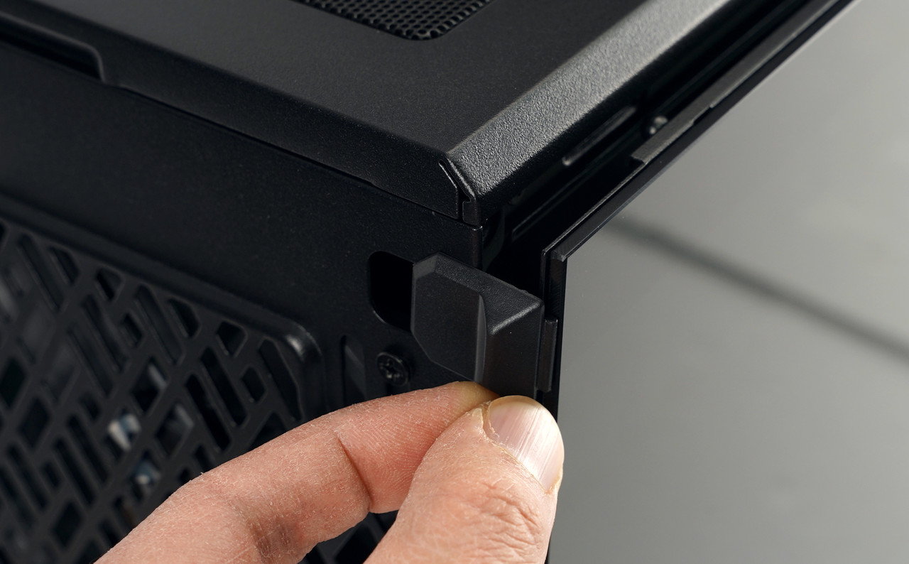 그런 불편함을 해소하기 위해 프랙탈 디자인 메시파이 2 시리즈에는 버튼식 고정장치가 도입되었다. 위 사진에 보이는 고정용 버튼을 손으로 밀면 곧바로 측면 패널이 분리되기 때문에 정말로 간편하다. 물론 다시 장착할 때는 그냥 버튼 위치에 맞춰서 측면 패널을 밀어넣기만 하면 된다.