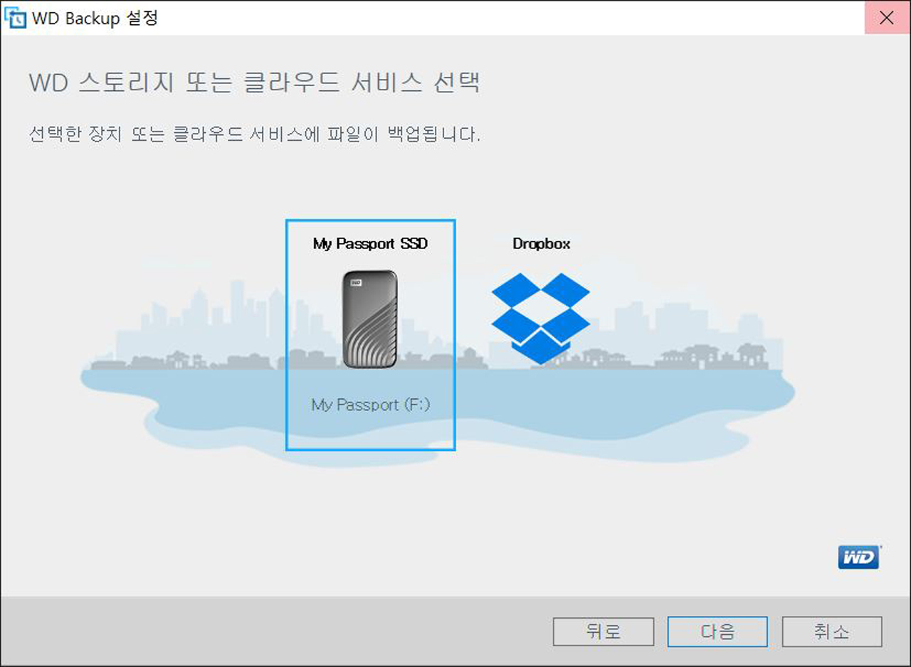 WD 백업 앱을 다운로드하여 설치하면 백업 설정을 시작할 수 있다. WD 마이 패스포트가 PC에 연결된 상태라면 자동으로 인식된다. WD 외장 스토리지 대신 클라우드 스토리지인 ‘드롭박스’를 선택하는 것도 가능하다.