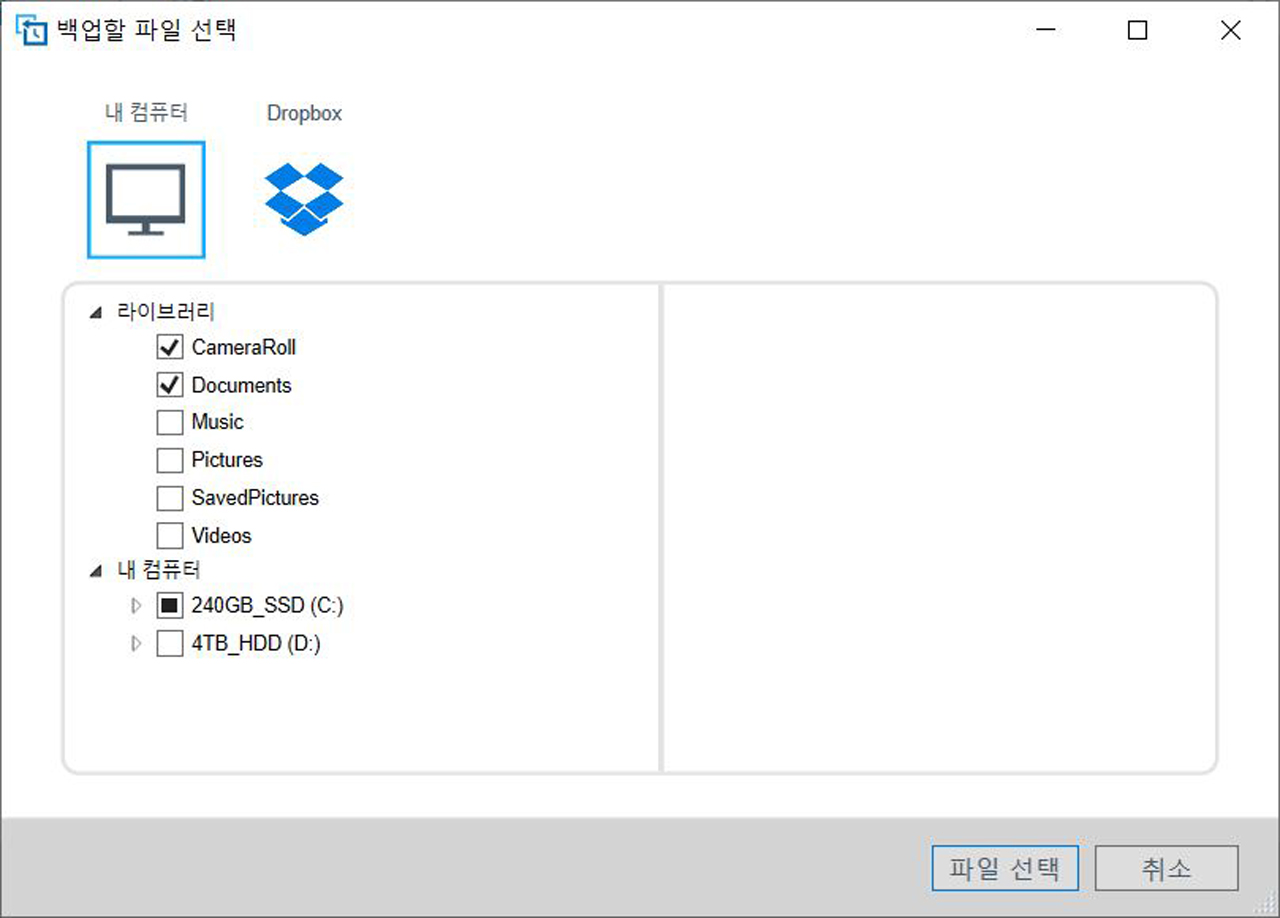 백업 일정을 정한 다음에는 백업할 폴더를 지정하면 된다. 윈도우 PC에서는 간편하게 ‘라이브러리’ 폴더를 선택할 수 있고 아니면 드라이브에서 사용자가 원하는 폴더를 정하면 된다.