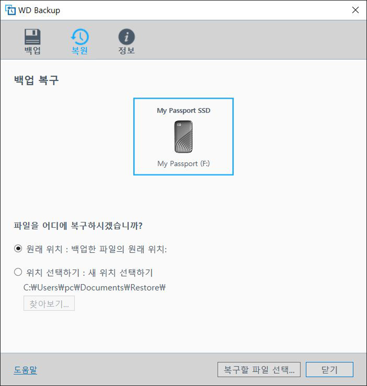 WD 마이 패스포트에 백업을 한 다음에는 사용자가 필요할 때 백업한 파일을 복원할 수 있다. 복원하는 파일은 원래 위치나 사용자가 원하는 경로에 복원시킬 수 있다.