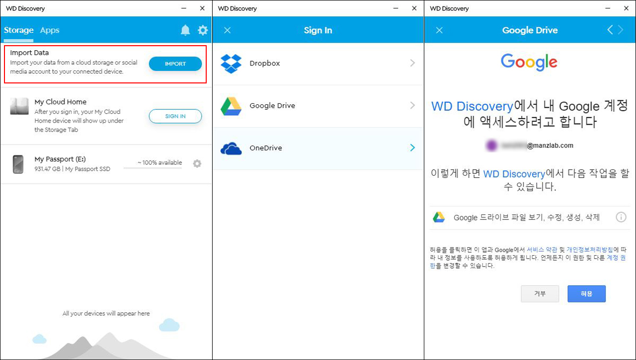 WD 디스커버리 첫 화면에서 ‘IMPORT’를 클릭하면 드롭박스, 구글 드라이브, 원드라이브 등 세 가지 클라우드 스토리지 항목이 표시되는데, 그 중 하나를 선택하고 접속한다.
