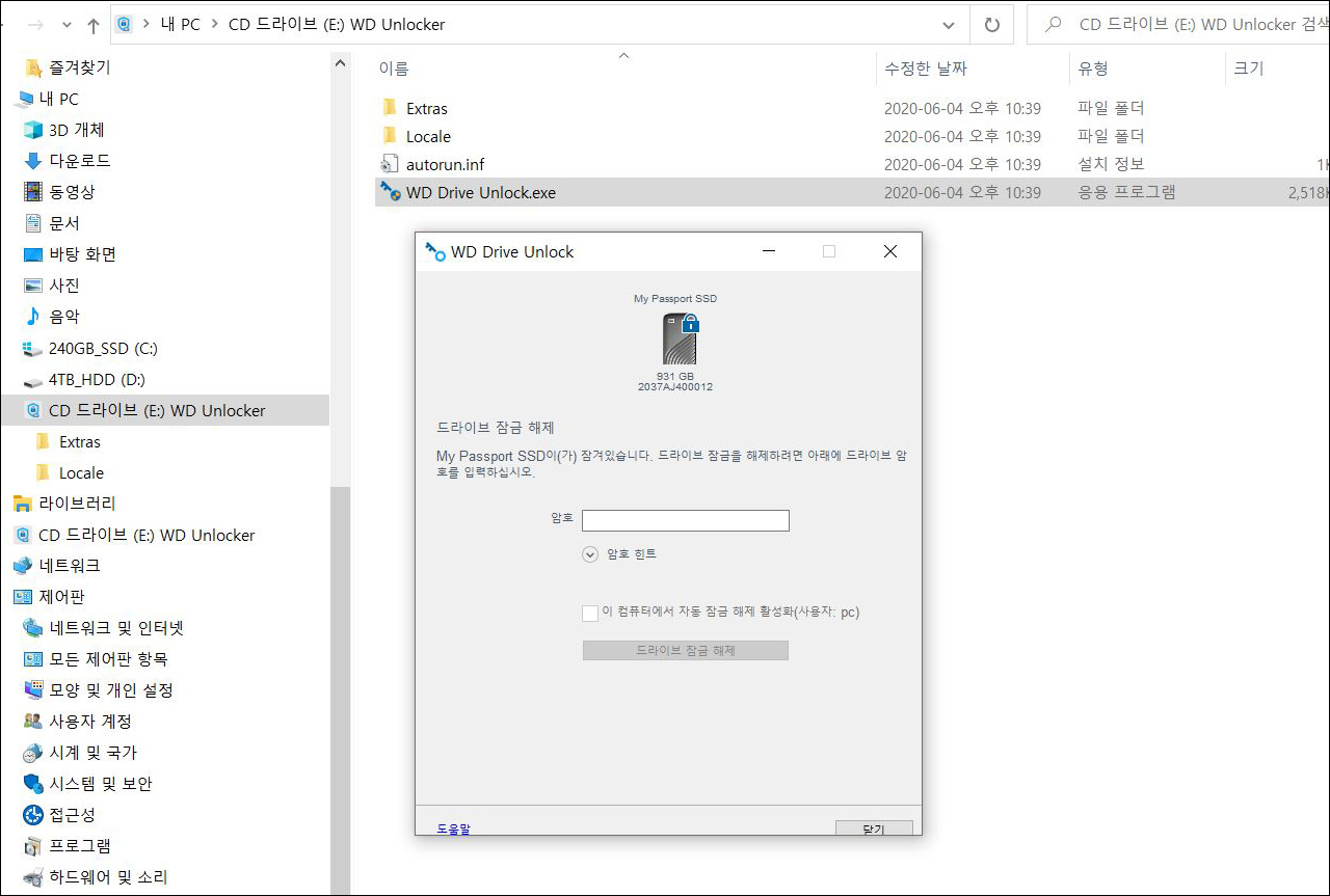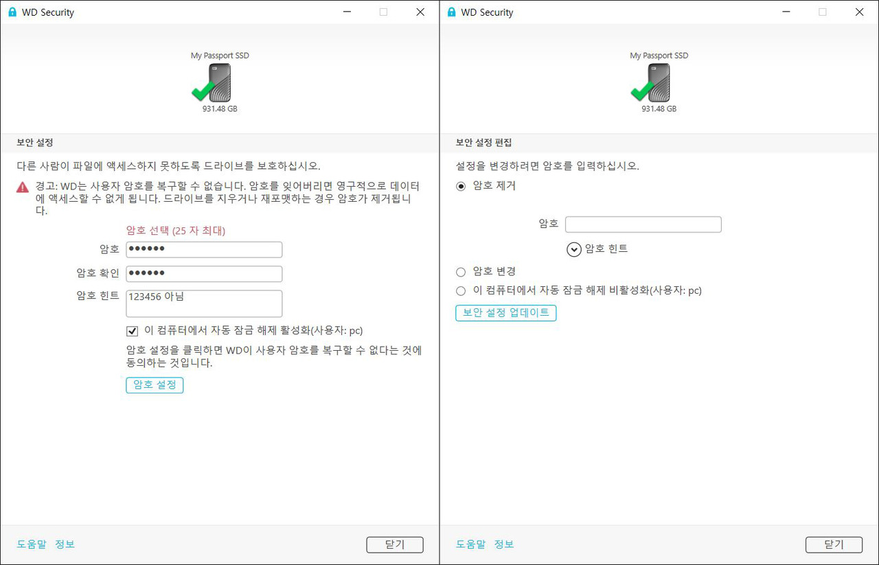 한편 사용자가 집이나 사무실에서도 일일이 암호를 입력하는 것은 불편하게 느껴질 수 있는데 그런 경우에는 ‘이 컴퓨터에서 자동 잠금 해제 활성화’로 PC를 등록해두면 된다. 그 시점부터 해당 PC에서는 암호를 입력하지 않고도 WD 마이 패스포트에 바로 접근할 수 있다.