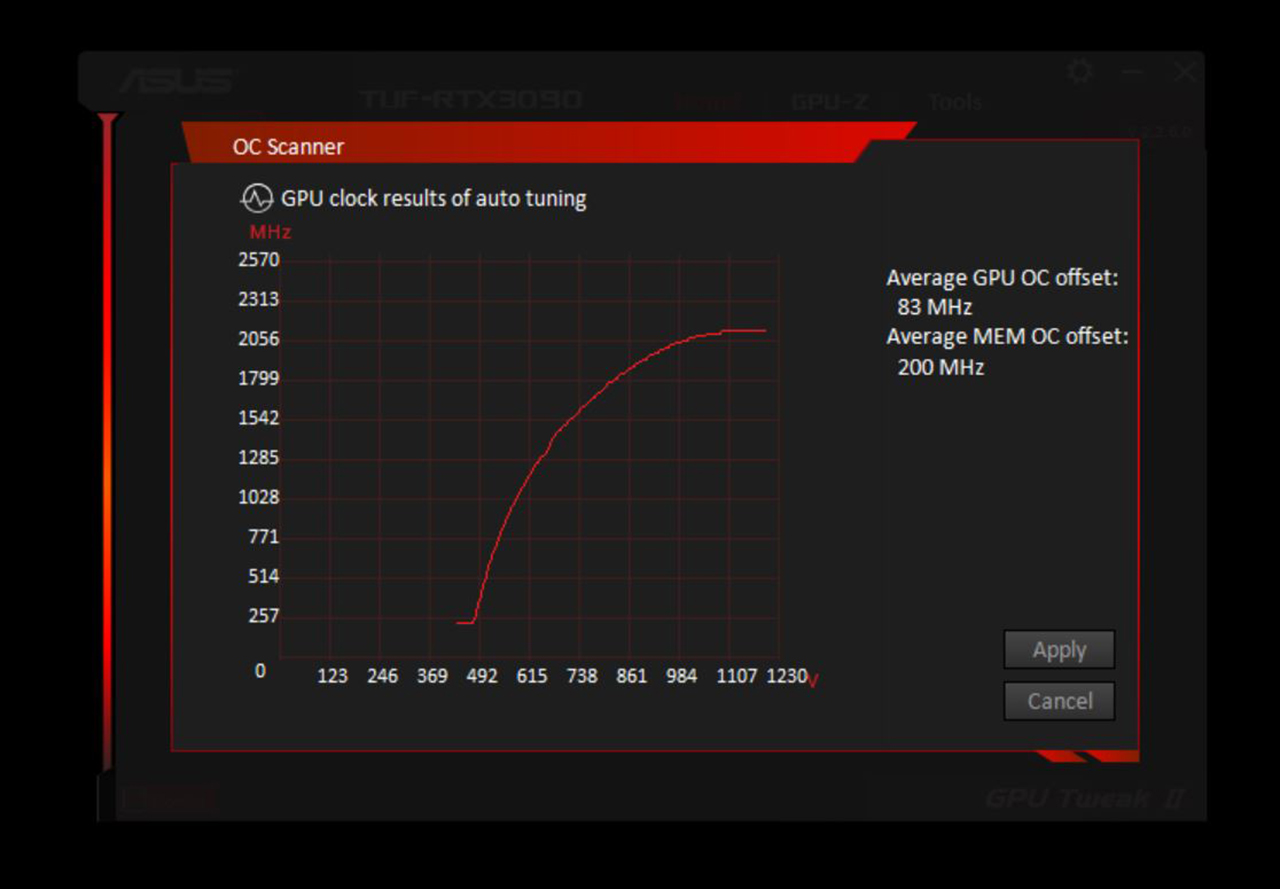 OC 스캐너 작업이 끝나면 오버클럭 가능한 GPU·메모리 클럭 수치를 보여준다. 맨즈랩 기사에 사용한 에이수스 TUF 게이밍 지포스 RTX 3090 OC는 GPU 클럭을 83MHz, 메모리 클럭은 200MHz 더 높일 수 있다는 결과가 나왔다. ‘Apply’ 버튼을 클릭하면 바로 해당 수치로 그래픽카드 오버클럭이 적용된다.