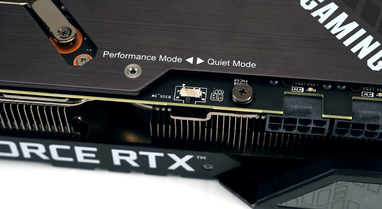 그래픽카드 8핀 보조전원 연결부 옆에는 ‘Performance Mode’(이하 퍼포먼스 모드)와 ‘Quiet Mode’(이하 콰이어트 모드)라고 적힌 작은 스위치가 보인다. 바이오스(BIOS) 모드 전환용 스위치이다.