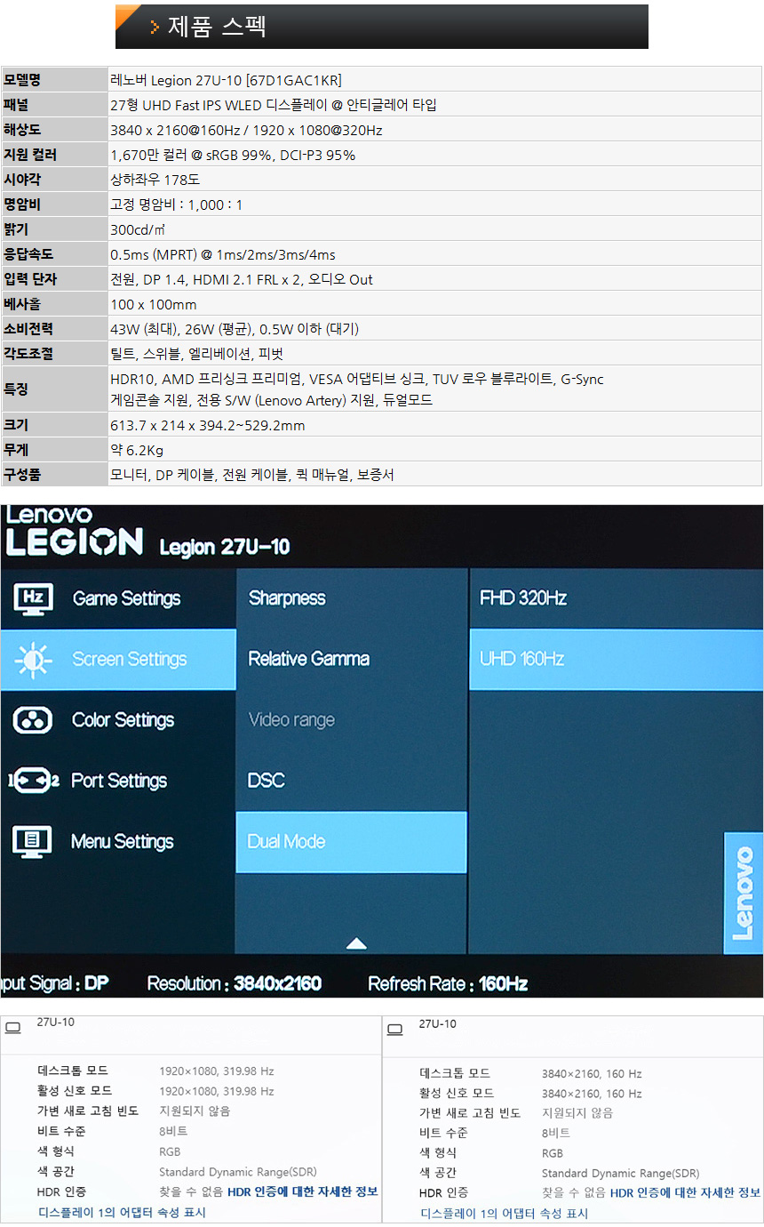 이번에 리뷰를 진행 할 레노버 Legion 27U-10 은 듀얼모드 기술이 적용된 4K 게이밍 모니터로 즐기는 게임이나 컨텐츠에 따라 해상도와 주사율을 손쉽게 변경할 수 있어 어떤 상황에서도 최상의 영상을 즐길 수 있다. Fast IPS 패널을 탑재해 보급형 게이밍 모니터를 압도하는 뛰어난 화질을 경험할 수 있으며 0.5ms에 불과한 짧은 응답시간을 지원해 잔상등으로 인한 스트레스 없이 게임이나 영상에 몰입할 수 있다.
