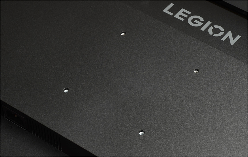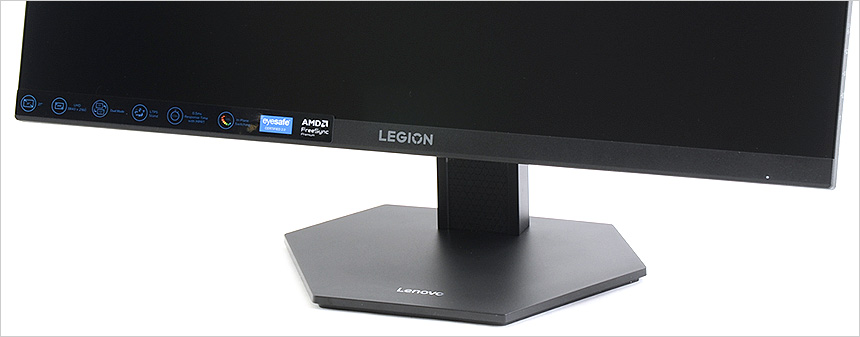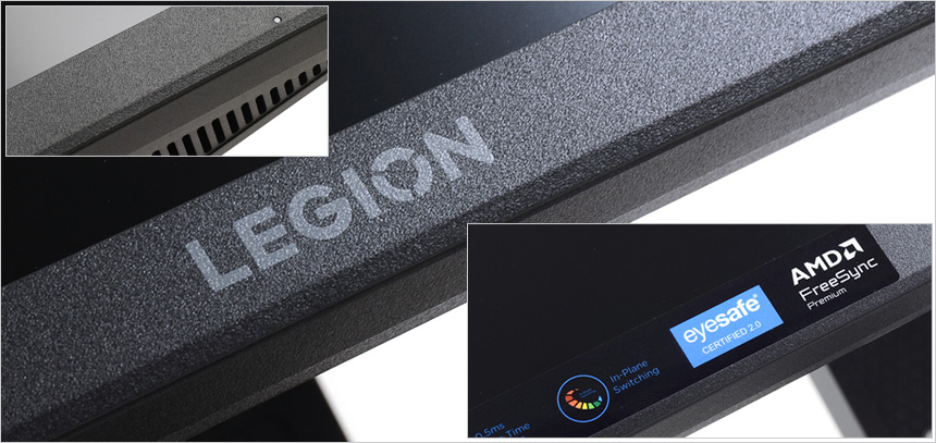 모니터 전면 하단부의 모습으로 중앙에 리전 레터링이 세겨져 있으며 측면 하단에는 LED 인디케이터와 통풍구 등이 설치된 것을 확인할 수 있다.