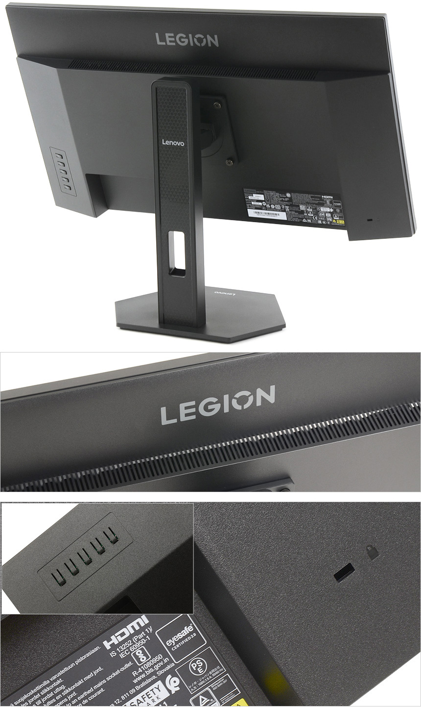 모니터 후면부의 모습으로 안정성을 높이기 위해 상단에 통풍구가 설치된 것을 확인할 수 있으며 손쉽게 모니터 기능을 설정할 수 있도록 5개의 버튼이 설치된 설치된 것을 확인할 수 있다. (위에서 두 번째 버튼을 누르면 듀얼모드를 빠르게 실행할 수 있다.) 또한 시큐리티 홀이 제공되어 공공장소에서 사용시 도난을 미연에 방지할 수 있다.