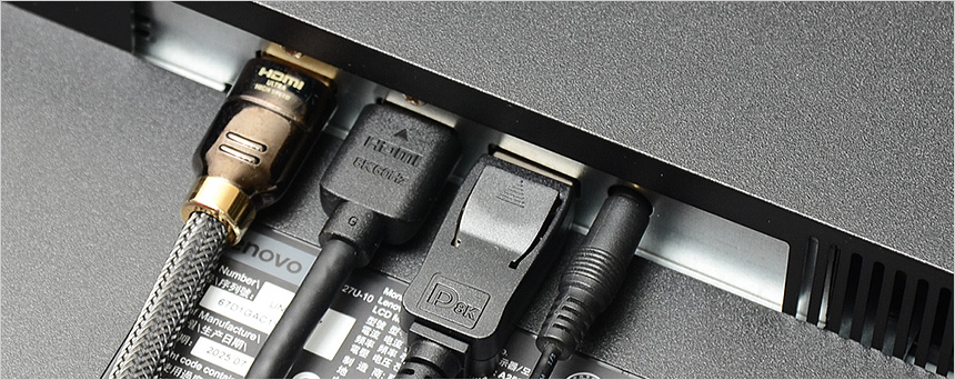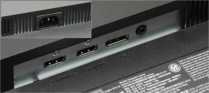 후면 중앙에는 100mm 베사홀이 설치되어 벽에 걸거나 ARM 등이 장착해 활용할 수 있으며 하단에는 2개의 HDMI 2.1 단자 지원으로 다양한 디바이스와 연결할 수 있다. 또한 DP 1.4 단자와 스피커나 이어폰 연결을 위한 오디오 Out 단자, 전원 단자도 지원한다.