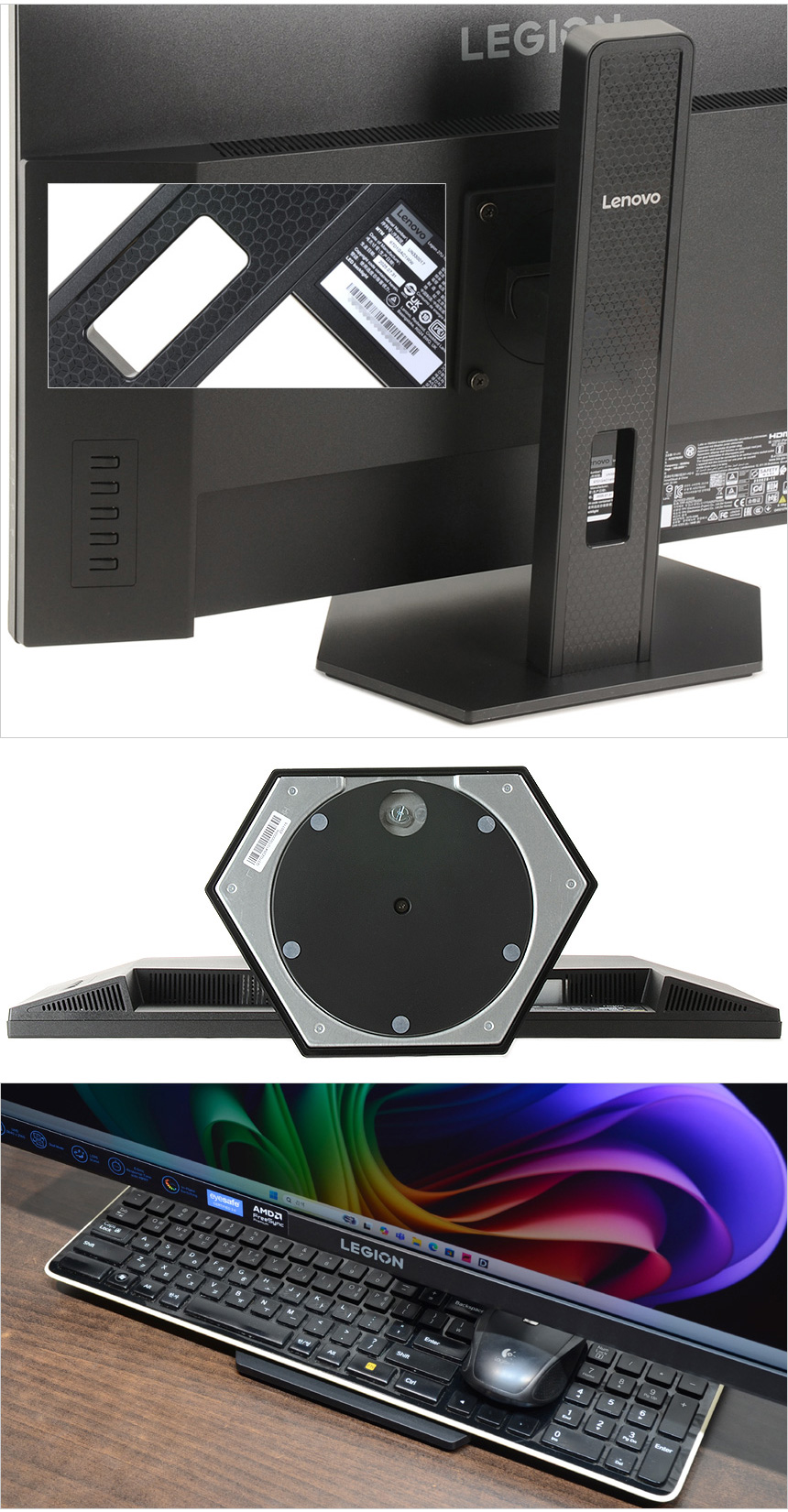 멀티스탠드의 모습으로 하단에 홀이 설치되어 케이블을 깔끔하게 정리할 수 있으며 바닥면에는 스위블을 위한 회전판과 고무패드가 장착되어 있는 것을 확인할 수 있다. (받침대의 공간이 넉넉해 키보드 등을 놓아두어 책상 공간을 확보할 수 있으며 스마트폰 등의 개인용품을 놓아둘 수 있다.)
