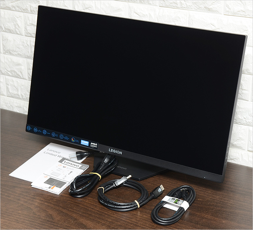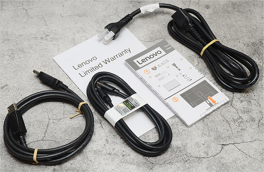 기본 제공되는 액세서리의 모습으로 전원 케이블과 HDMI & DP 케이블, 퀵 매뉴얼, 보증서가 포함된 것을 확인할 수 있다.
