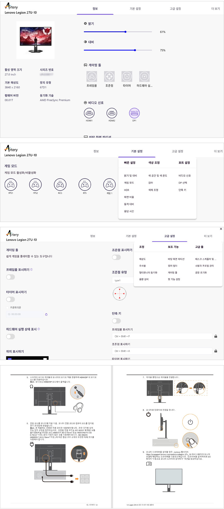 레노버 모니터는 전용 S/W를 제공해 PC를 이용해 모니터를 컨트롤 할 수 있다. 상단의 사진은 레노버 디스플레이 컨트롤 센터를 실행한 모습으로 시스템 정보가 표시되며 밝기와 명암비, 입력소스, 색온도 등을 빠르게 조정할 수 있다. 기본기능과 고급기능으로 구분되며 OSD에서 지원하는 기능 뿐만 아니라 윈도우 디스플레이 설정도 제공해 편하게 모니터를 사용자에 맞게 셋팅할 수 있었다. 또한 사용설명서도 확인할 수 있다. (자세한 사항은 동영상을 참조하기 바란다.)