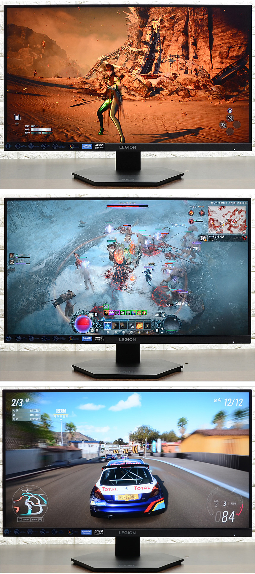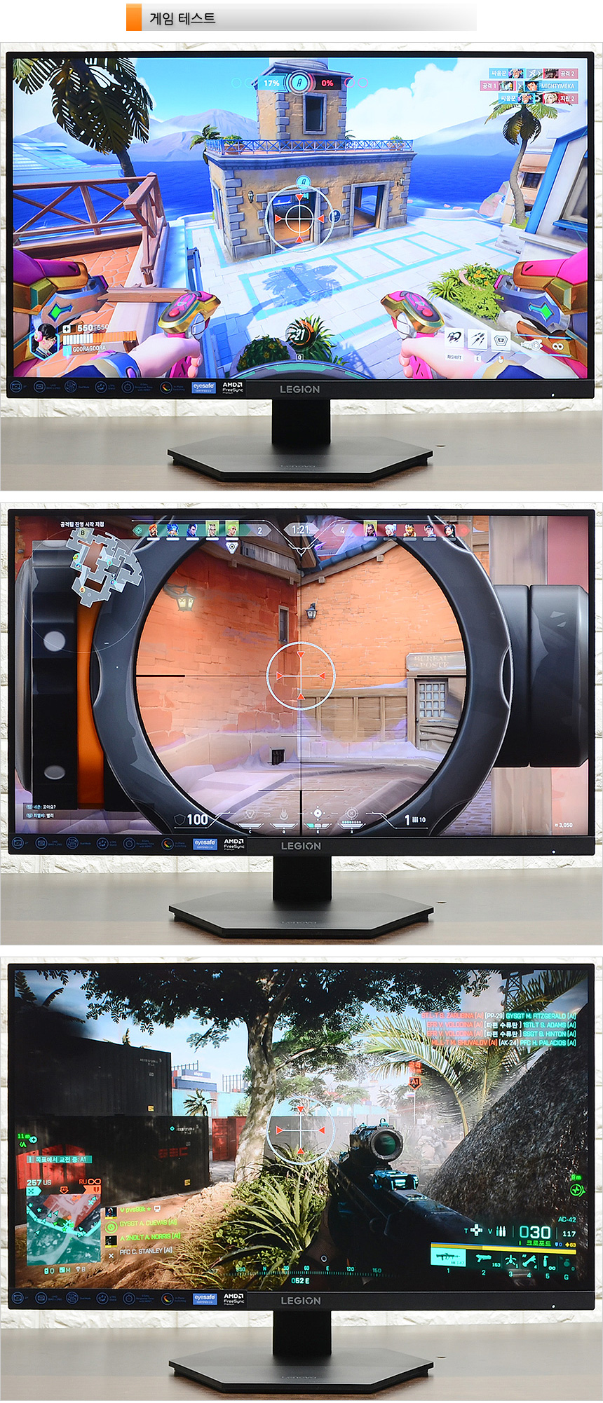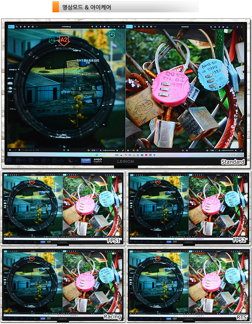다양한 게임모드 지원으로 즐기는 게임에 최적화된 영상을 즐길 수 있다. 상단의 사진은 지원 모드를 비교한 모습으로 영상의 밝기가 확연하게 달라지는 것을 확인할 수 있었다. 게임에 따라 일일이 밝기를 조절해야 하는 모니터들과 달리 전용 S/W 통해 게임 실행중에도 손쉽게 영상을 조정할 수 있다.