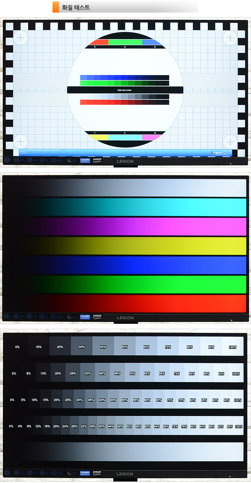 모니터 테스트 프로그램을 이용해 화질 테스트를 진행하고 있는 모습으로 IPS 패널 특유의 진한 원색표현이 인상적이었으며 빛샘등으로 인한 특정 부분의 색 왜곡 현상도 없는 것을 확인할 수 있었다. 또한 대부분의 IPS 모니터와 같이 1,000:1 의 고정명암비를 지원해 그레이스케일 차트를 확연하게 구분할 수 있었다. (HDR10을 지원해 깊이감 있는 영상을 즐길 수 있다.)