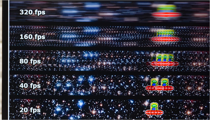 FHD 해상도에서 최대 320Hz 주사율 설정이 가능해 60Hz 이나 144 Hz 주사율을 지원하는 일반 모니터와 비교되는 부드러운 영상을 즐길 수 있다. 여기에 0.5ms 의 응답속도까지 더해져 빠르게 움직이는 영상을 부드럽고 선명하게 표현해 준다. 상단의 사진은 주사율에 따른 캐릭터 움직임을 카메라로 촬영한 모습으로 (셔터속도 1/30) 하위 프레임과 확연한 차이를 보여주었다.