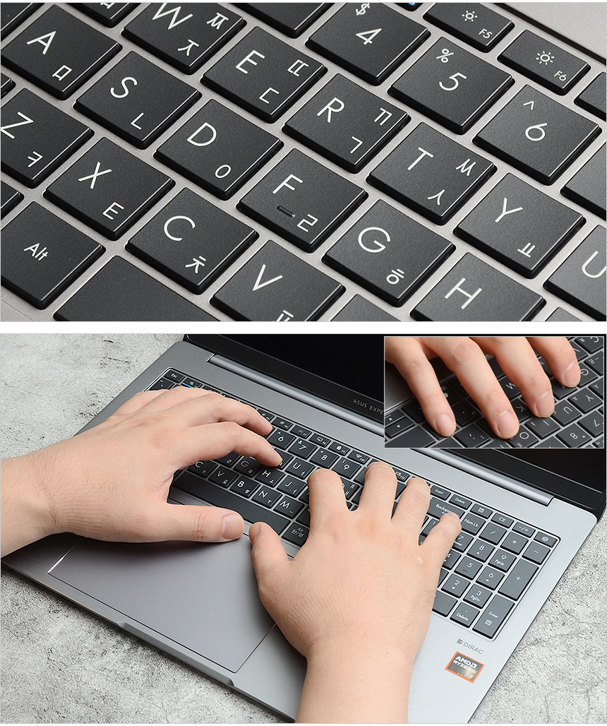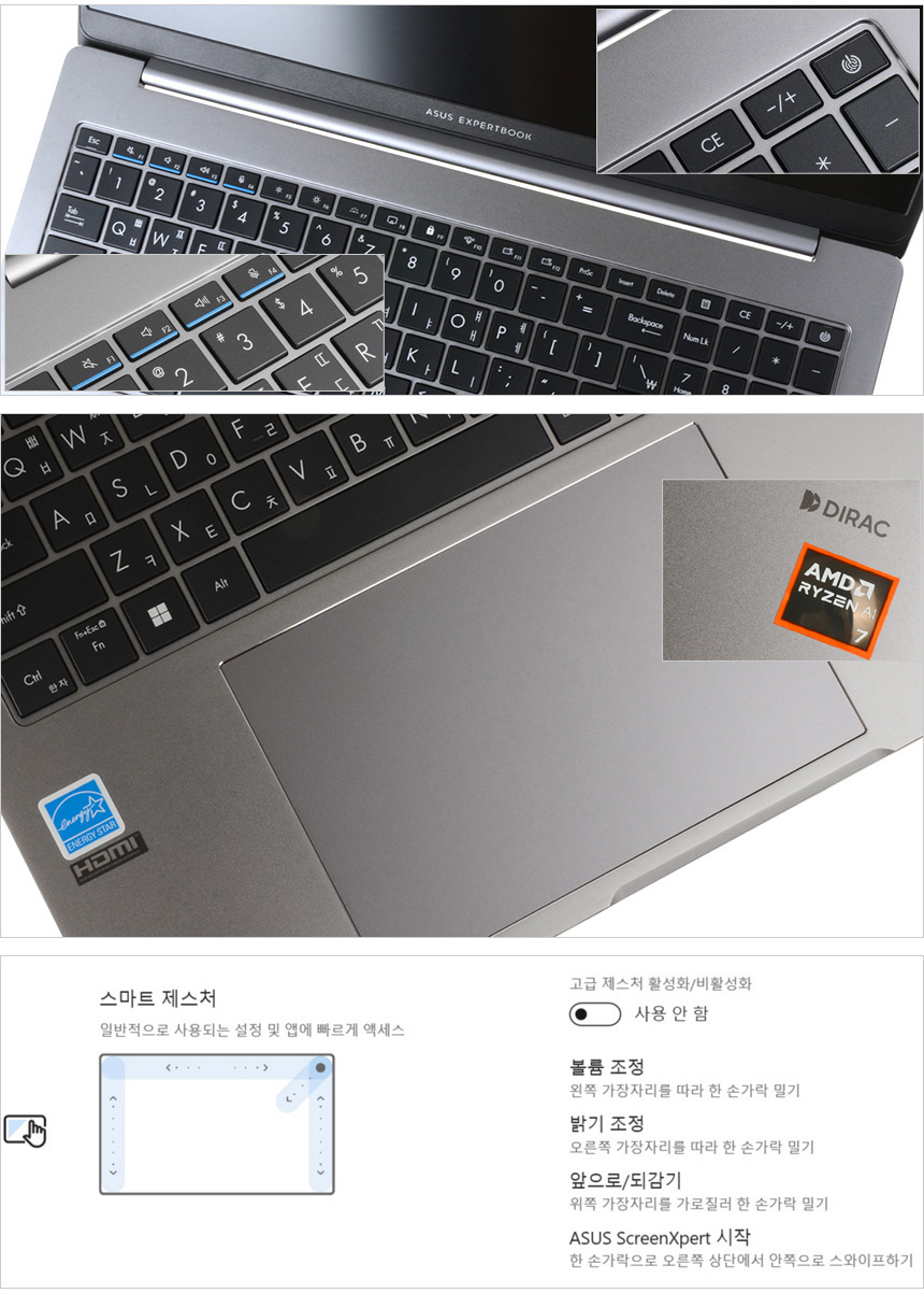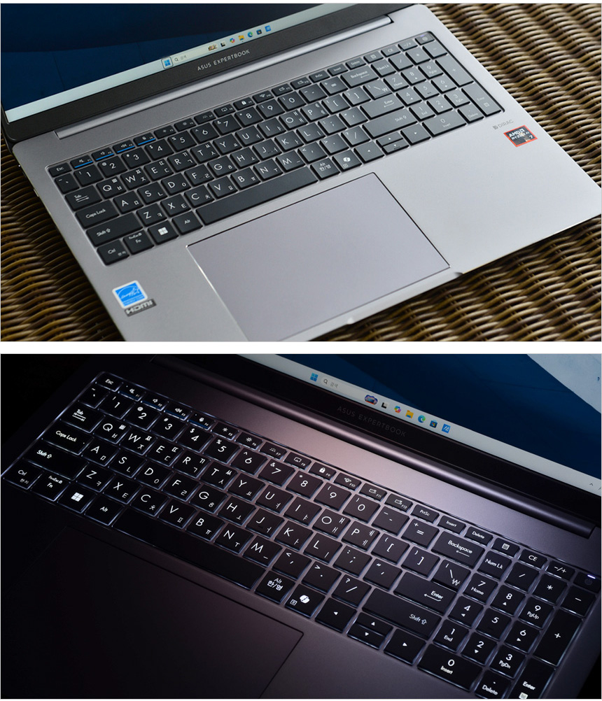 키보드 1열에는 밝기, 볼륨 등을 조정할 수 있는 다양한 펑션키가 설치되어 있고 전원 버튼이 장착된 것도 확인할 수 있다. (전원 버튼은 쉽게 눌리지 않도록 살짝 들어가 있으며 지문인식 센서를 탑재해 보안성과 편의성을 높일 수 있다.) 화상회의에서 많이 사용하는 볼륨과 마이크 음소거 키는 주목성을 높이기 위해 파란색 라인을 적용했으며 F11 과 F12키는 사용자가 원하는 기능을 적용해 사용할 수 있다. (ASUS ExpertWidget에서 단축키 지정이 가능하다.) 하단 중앙에는 다이아몬드 컷팅이 적용된 대형 터치패드가 설치되어 있다. 특히 젠북등에서 지원하는 스마트 제스처를 지원해 (MyASUS에서 설정 가능) 마우스를 사용하기 힘든 장소에서도 손쉽게 노트북을 조작할 수 있다.