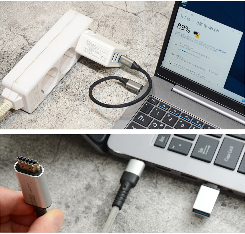 2개의 C타입 단자는 디스플레이 출력 기능을 지원해 모니터나 프로젝터 등을 연결할 수 있으며 젠더를 구입해 장착하면 A타입의 주변기기도 연결할 수 있다. 또한 PD충전 지원으로 기본 어댑터 뿐만 아니라 시중에서 쉽게 구입할 수 있는 PD 충전기를 이용해 전원을 공급할 수 있다. (시중에서 쉽게 구입할 수 있는 65W PD 충전기로 테스트 했는데 정상적으로 작동했다. 단, 저속충전기로 작동하는점 참고하기 바란다.)