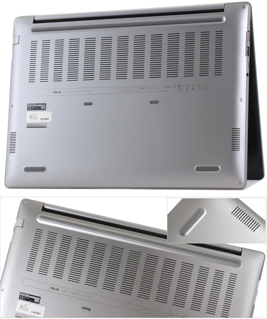 노트북 바닥면의 모습으로 안정성을 높이기 위해 팬과 칩셋이 설치된 상단에 통풍구가 설치되어 있고 상단과 하단에 고무패드가 부착되어 미끄러짐을 미연에 방지한다. 또한 하단 양 측면에는 듀얼 스피커가 설치되어 퀄리티 높은 사운드를 즐길 수 있다. @ 전원설정을 균형조정 (밝기 50%, 에어플레인 모드, 저소음 모드) 으로 지정하고 슬라이드쇼를 무한 반복해 본 결과 22시간 17분 동안 재생된 후 시스템 대기모드로 진입하는 것을 확인하였다. 또한 노트북을 끄고 1시간 동안 충전했을 때 90% 배터리가 충전되는 것을 확인할 수 있었다. (긴 배터리 사용시간과 빠른 충전속도가 아주 마음에 든다.)