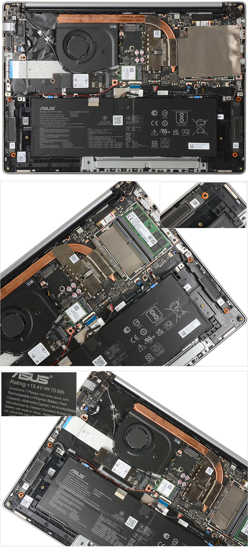 바닥면 내부의 모습으로 CPU 열을 식혀주기 위해 상단에 팬과 히트파이프가 설치된 것을 확인할 수 있으며 하단에는 4548mAh 용량의 리튬이온 배터리가 장착된 것을 확인할 수 있다. 또한 모서리 부분에는 스피커와 마그네틱이 부착된 것이 눈에 띈다.