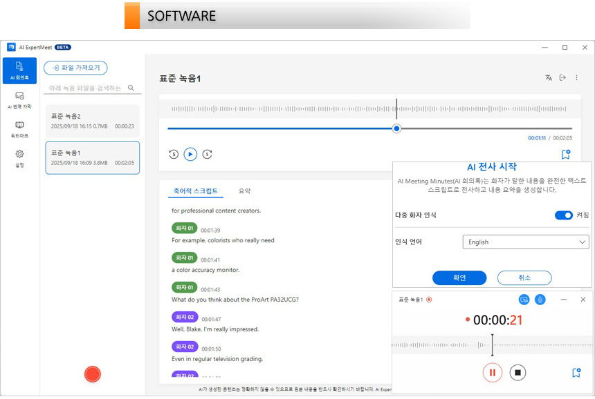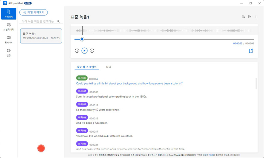 AI ExpertMeet에서 AI 회의록을 지원해 회의나 미팅을 마치고 별도로 시간을 내어 회의록을 작성할 필요가 없다. 회의에 맞춰 녹음을 시작하면 음성이 녹음될 뿐만 아니라 테스트로 표기해 주는 AI 전사기능을 지원해 미팅 내용을 완벽하게 확인할 수 있기 때문이다. 녹음된 음성을 확인해 보았는데 음성이 대단히 깨끗했으며 다중화자 인식 기술이 적용되어 미팅이나 회의, 컨퍼런스 콜 이후 오디오가 텍스트로 표시될 때 말한사람을 명확하게 알 수 있었다.