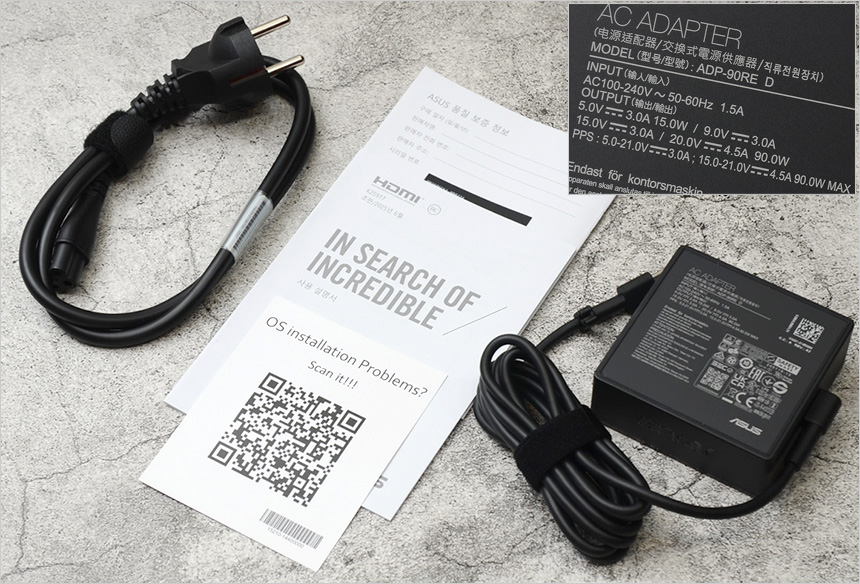 기본 제공되는 액세서리의 모습으로 90W 전원 어댑터와 전원케이블, 퀵 매뉴얼, 보증서 등이 제공된다. (전원 어댑터는 다양한 전압을 지원해 스마트폰 충전기로도 활용할 수 있다.)