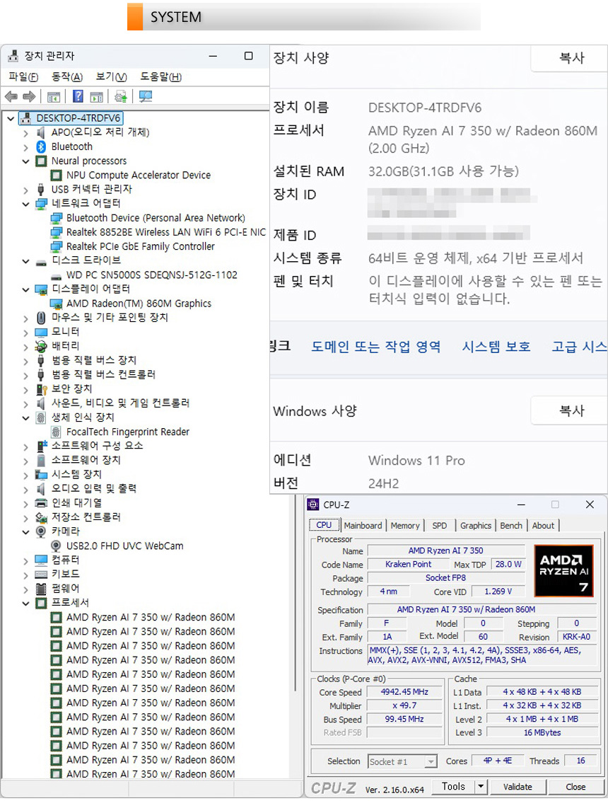 시스템 정보를 확인하고 있는 모습으로 NPU를 탑재해 AI 퍼포먼스를 한층 높인 AMD 라이젠 AI 7 350 프로세서가 장착된 것을 확인할 수 있다. 8코어 16스레드에 라데온 860M 내장 그래픽을 지원해 다용도로 노트북을 활용할 수 있다. 또한 16GB 정도의 용량을 지원하는 경쟁 모델들과 달리 32GB 대용량 DDR5 메모리가 탑재되어 있고 Wi-Fi 6 무선랜과 지문 인식 센서, FHD 웹캠이 설치된 것을 확인할 수 있다.
