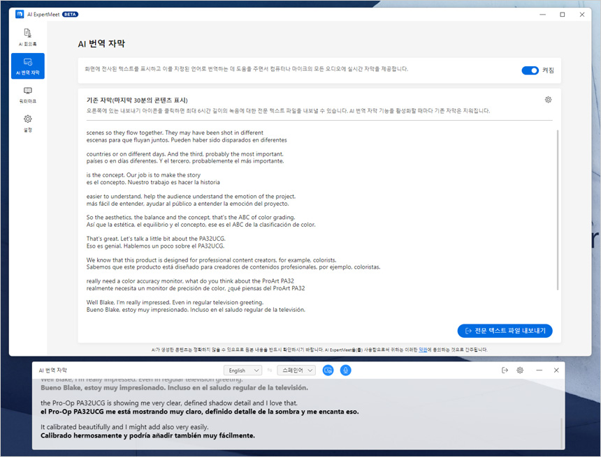 AI ExpertMeet는 베타 버전으로 한국어를 정식 지원하지 않는다. 하지만 한국어 영상을 틀거나 말을 했을 때 영문 자막이 제공되는 것을 확인할 수 있었다. 정확성도 상당히 뛰어난 수준으로 (물론 정식 문서용으로 활용할 경우 후보정을 해야 한다.) 유용하게 활용할 수 있을 것이다. 직장인 들이 한국어로 녹음한 회의기록 등을 영문으로 만들어야 할 경우 작업 시간을 대폭 단축할 수 있으며 영문자막을 만들어 유튜브 영상에 등록하고 싶은 기업용 유튜브 제작자나 일반유튜버 들도 편하게 작업할 수 있다.