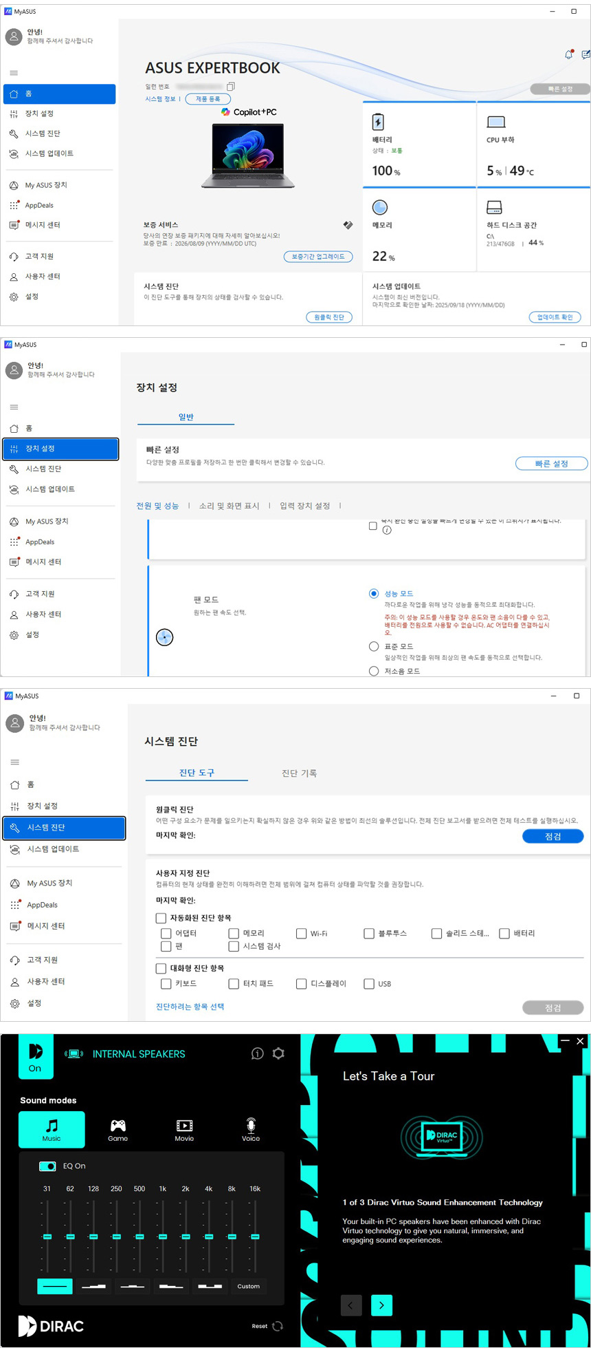 MyASUS 앱을 실행한 모습으로 노트북의 다양한 기능을 손쉽게 설정할 수 있으며 업데이트 기능을 지원해 손쉽게 최신 드라이버를 설치할 수 있다. 또한 원클릭 진단 기능을 지원해 시스템의 문제를 빠르게 파악할 수 있다. 또한 DIRAC 오디오를 지원하는 제품으로 전용앱을 통해 사용자의 취향이나 실행하는 컨텐츠에 맞게 음색을 설정할 수 있다. (프로파일 지정 뿐만 아니라 EQ 설정도 가능하다.)