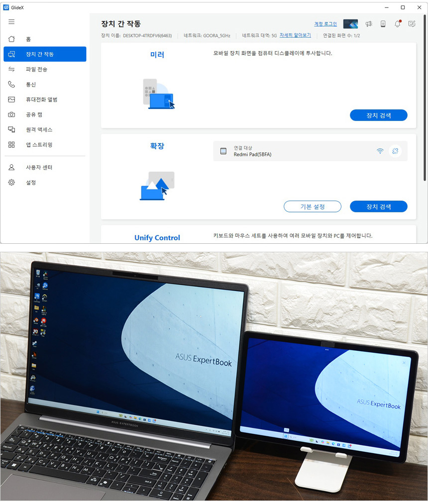 GlideX 앱을 지원해 화면의 복제나 확장, 유니파이 컨트롤이 가능하다. 상단의 사진은 확장 기능을 실행한 모습으로 태블릿 PC를 확장 모니터로 사용할 수 있어 외부에서 좀더 편하게 작업을 할 수 있다. (참고로 미러를 선택하면 스마트폰 화면이 노트북에 표시된다.)