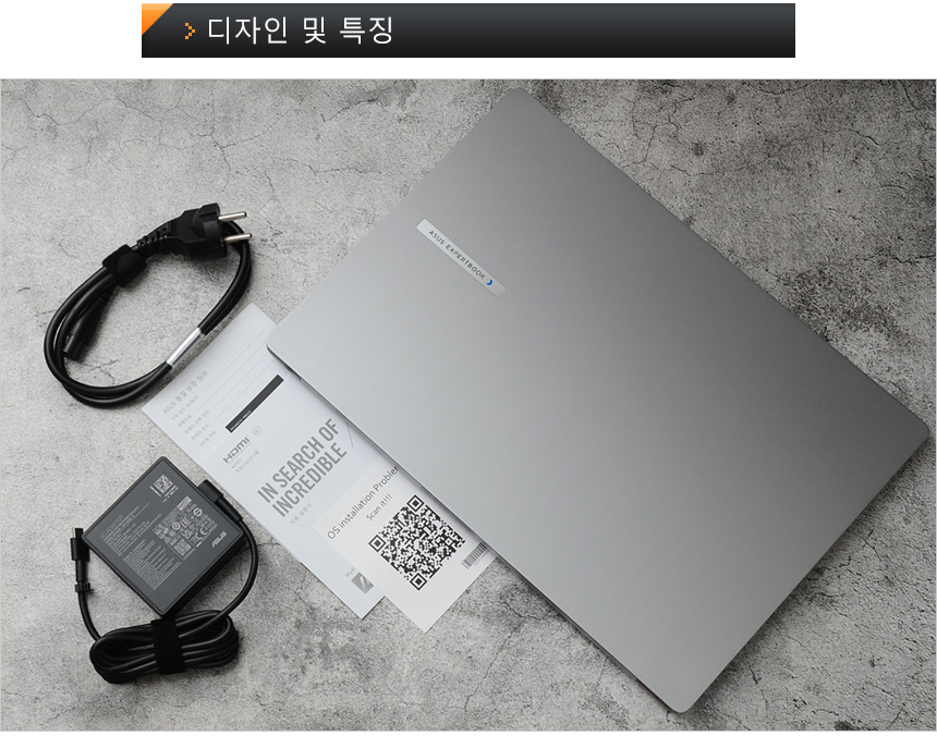 풀KIT 의 모습으로 노트북을 비롯해 C타입의 90W 전원 어댑터와 전원 케이블, 보증서, 퀵 매뉴얼이 제공되는 것을 확인할 수 있다. 또한 OS를 설치중 문제가 발생했을 때 빠르게 조치를 취할 수 있도록 QR 코드로된 가이드를 제공한다.