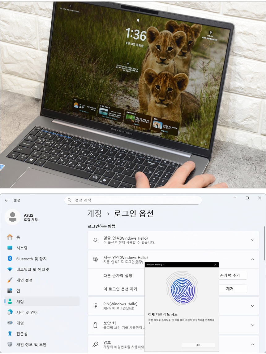 지문인식 센서가 장착되어 보안성을 한층 높일 수 있다. 설정-계정에 있는 로그온 옵션에서 지문을 등록할 수 있으며 인식율도 뛰어나 편하게 사용할 수 있었다. (사무실이나 외부에서 다른 사람의 노트북 사용을 미연에 방지할 수 있다.)