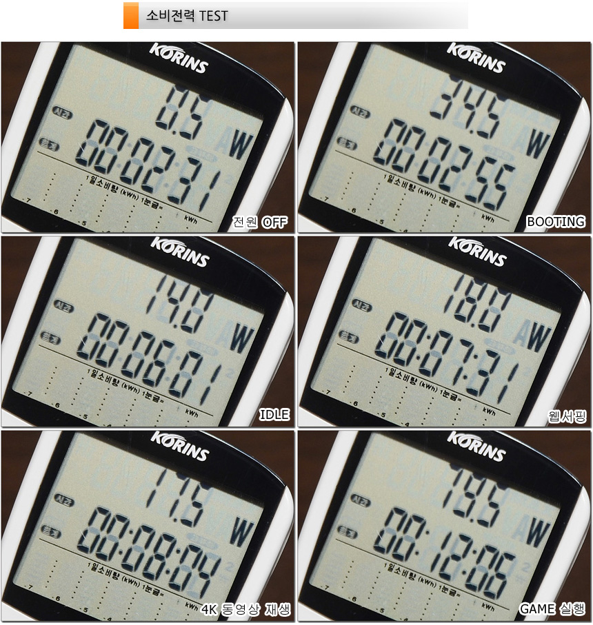 소비전력 테스트를 진행하고 있는 모습으로 (최고성능 모드) 캐주얼한 작업시에는 30W 내외의 저전력으로 작동했으며 랜더링이나 게임 실행시에는 80W 까지 소비전력이 올라가는 것을 확인할 수 있었다. 저전력으로 작동하는 페이퍼 작업 위주의 비즈니스 노트북과 달리 높은 소비전력을 통해 더 강력한 성능을 구현하는 모델이다.