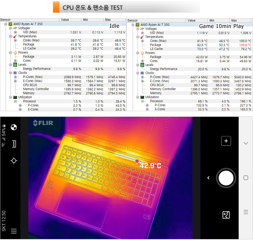 팬소음 테스트를 진행하고 있는 모습으로 캐주얼한 작업시 팬소음이 들리지 않았으며 게임을 실행했을 때에는 노트북이 최고 성능으로 동작해 팬소음이 커지는 것을 확인할 수 있었다. (단, 고주파음에 발생하지 않아 크게 신경쓰이지 않았다.)