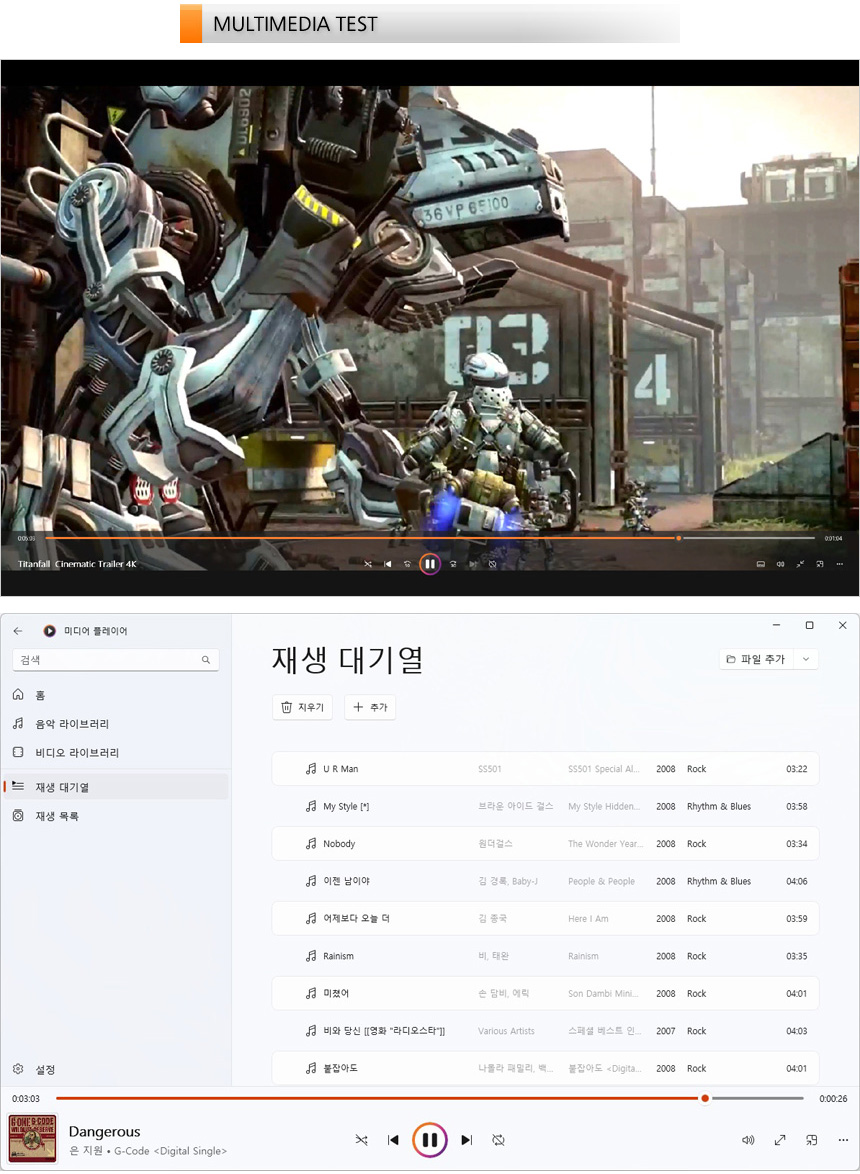 4K 동영상을 이용해 멀티미디어 테스트를 진행하고 있는 모습으로 시야각 없는 선명한 영상을 보여주었으며 대화면에 슬림 베젤을 적용해 높은 몰입감을 경험할 수 있었다. 또한 MP3 파일을 이용해 사운드 테스트를 진행하고 있는 모습으로 기대 이상의 높은 출력으로 시원시원한 사운드를 즐길 수 있었다. 중고음 뿐만 아니라 저음도 충분히 들려주어 만족스럽게 음악을 즐길 수 있었다.