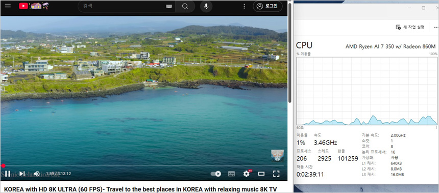 유튜브 고화질 동영상을 이용해 CPU 점유율을 테스트 하고 있는 모습으로 (2160P@60FPS) 1-12% 대의 점유율을 보여 주었으며 인터넷을 실행했을 때 20% 초반까지 점유율이 올라가는 것을 확인할 수 있었다.