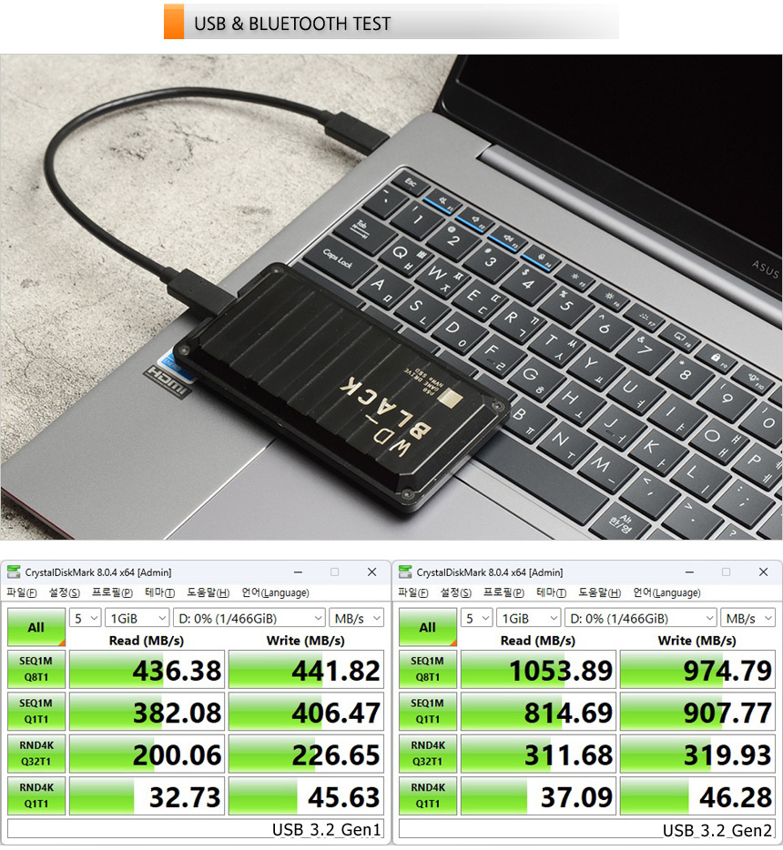 2개의 C타입 단자가 USB 3.2 Gen2를 지원해 빠른 데이터 전송이 가능하다. 상단의 사진은 외장 SSD를 이용해 테스트를 진행하고 있는 모습으로 USB 3.2 Gen1과 확연한 차이를 보여주었다. 대용량 데이터 전송이 잦은 유저들이라면 만족하며 사용할 수 있을 것이다.
