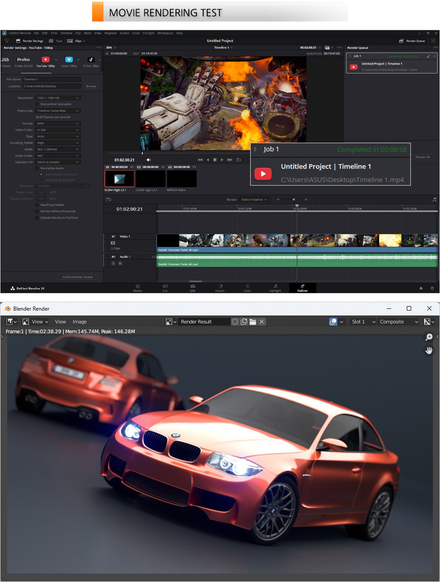 영상편집 S/W 다빈치 리졸브를 이용해 랜더링 테스트를 진행하고 있는 모습으로 (640MB, 920MB, 990MB 4K 동영상을 단일 동영상으로 랜더링, FHD 해상도에 H.264 비디오 코덱) 8분 58초가 소요되는 것을 확인할 수 있었다. 또한 블랜더 랜더링 테스트에서는 2분대의 랜더링 시간을 보여주었다. (영상편집 랜더링 시간은 길다. 하지만 CPU를 주로 활용하는 블랜더 랜더링 시간은 상당히 빠른 것을 확인할 수 있다.)
