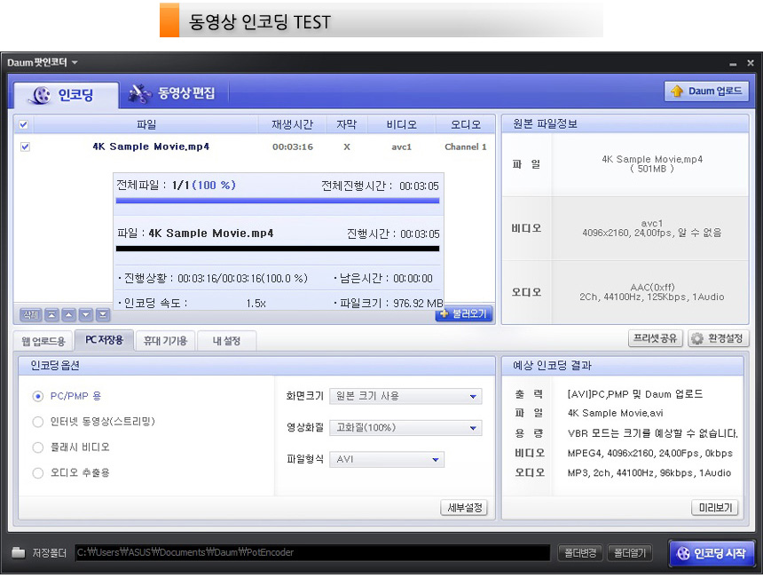 다음 팟인코더를 이용해 4K 동영상의 인코딩을 진행하고 있는 모습으로 최고급형 게이밍 노트북 수준의 빠른 인코딩 시간을 보여주었다.