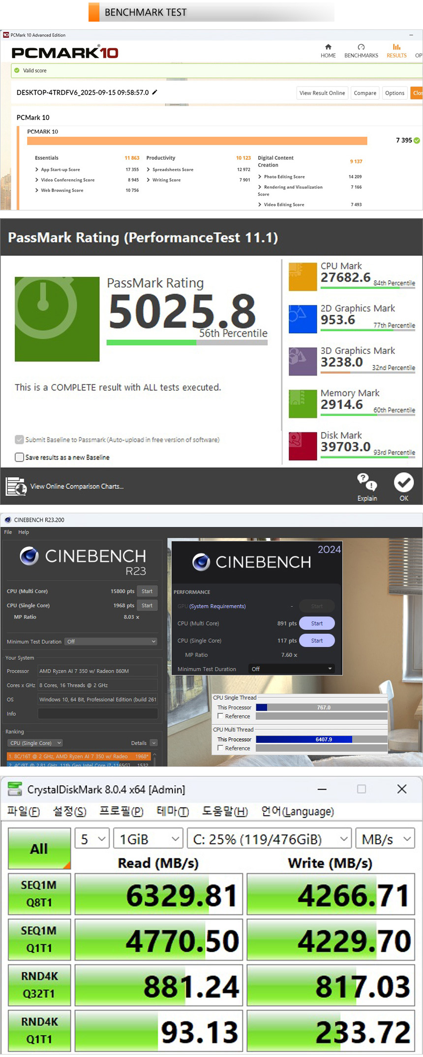 벤치마크 프로그램을 이용해 기기의 성능을 확인하고 있는 모습으로 높은 성능을 필요로 하는 업무용 S/W 도 부드럽게 실행할 수 있는 스코어를 보여주었다. 또한 저장장치의 속도를 확인하고 있는 모습으로 PCIe Gen4 SSD가 장착되어 속도가 무척 빠른 것을 확인할 수 있다.