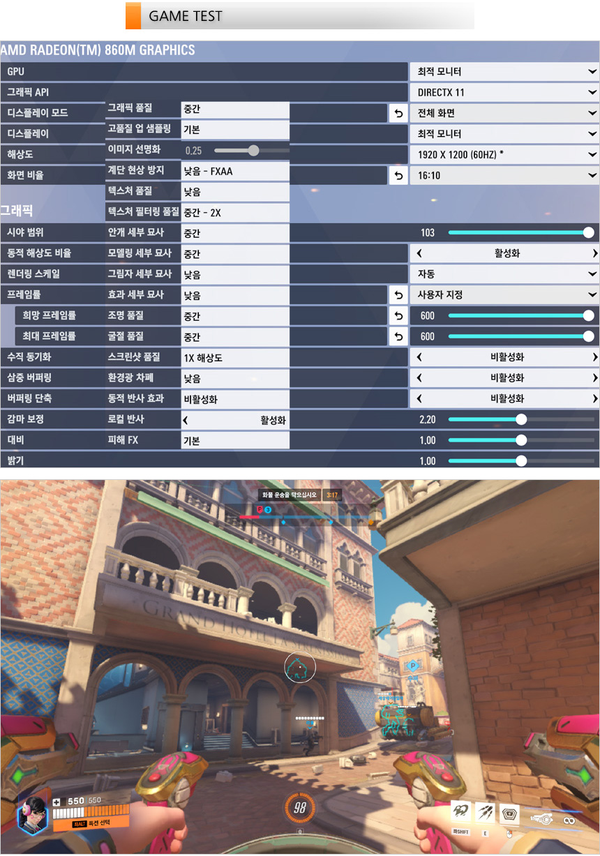 게임 테스트를 진행하고 있는 모습으로 오버워치 2를 중간 옵션에서 플레이 했을때 119-151 프레임을 보여주었다. 부드럽게 게임을 플레이 할 수 있을 것이다. (65W 전원 어댑터를 사용하는 동급 경쟁모델 대비 15프레임 이상 높은 성능을 보여주었다.)