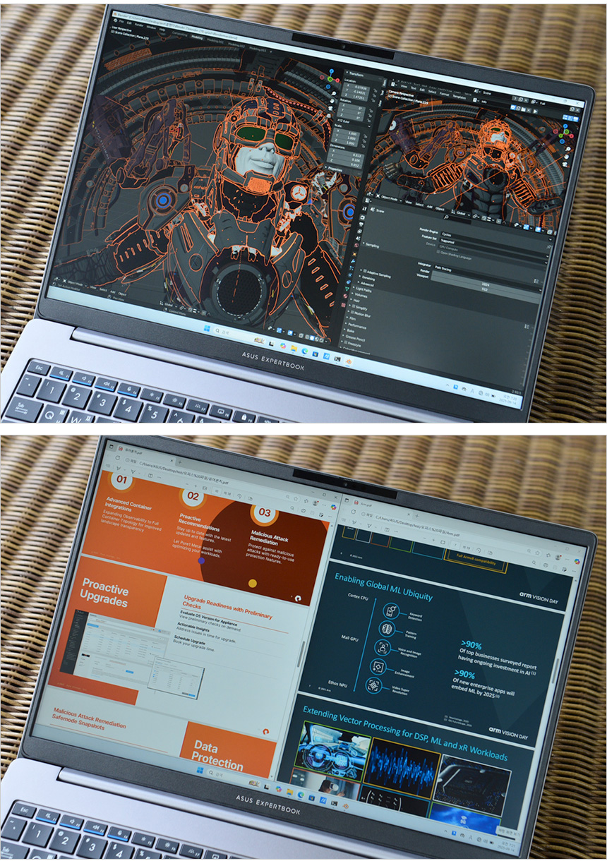 비즈니스에 특화된 S/W 와 기능 지원도 인상적이었다. AI ExpertMeet에서 워터마크 기술을 지원해 데이터 외부 유츨 가능성을 최소화 할 수 있으며 180도 레이 플랫 힌지를 적용해 회의나 미팅에서 손쉽게 정보를 공유할 수 있다. 특히 이 제품은 화면회전을 지원해 서로 맞은편에 앉아 1:1 미팅을 할 때 효과적으로 정보를 전달 수 있다.