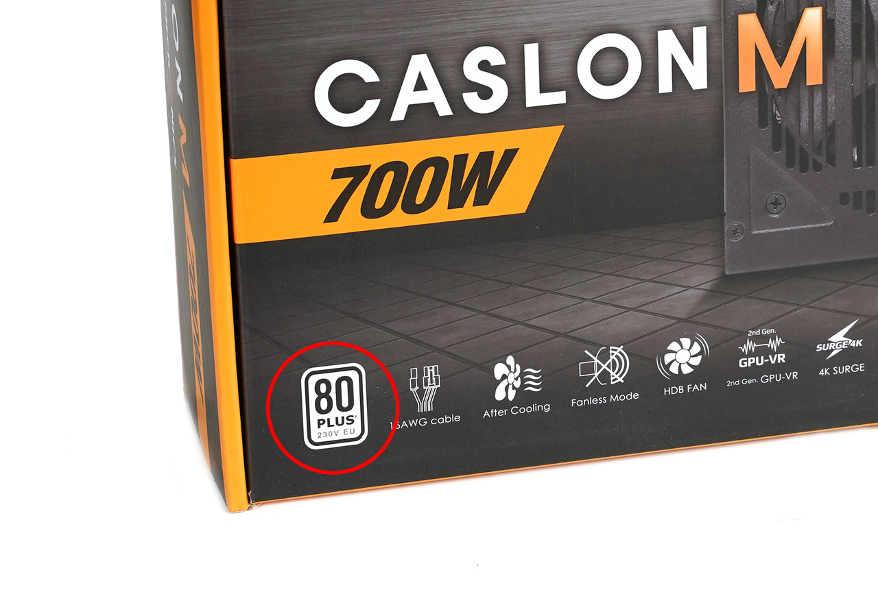 효율에 따라 ‘스탠다드’(Standard), ‘브론즈’(Bronze), ‘실버’(Silver), ‘골드’(Gold), ‘플래티넘’(Platinum), ‘티타늄’(Titanium) 등 총 여섯 가지로 등급이 나뉘는데 캐슬론 M 시리즈는 80PLUS 브론즈 인증을 받았다. 230V(볼트) EU(유럽 전기 플러그) 기준으로 최대 효율 85%, 최소 효율 81%를 넘으면 통과할 수 있는 등급이다.